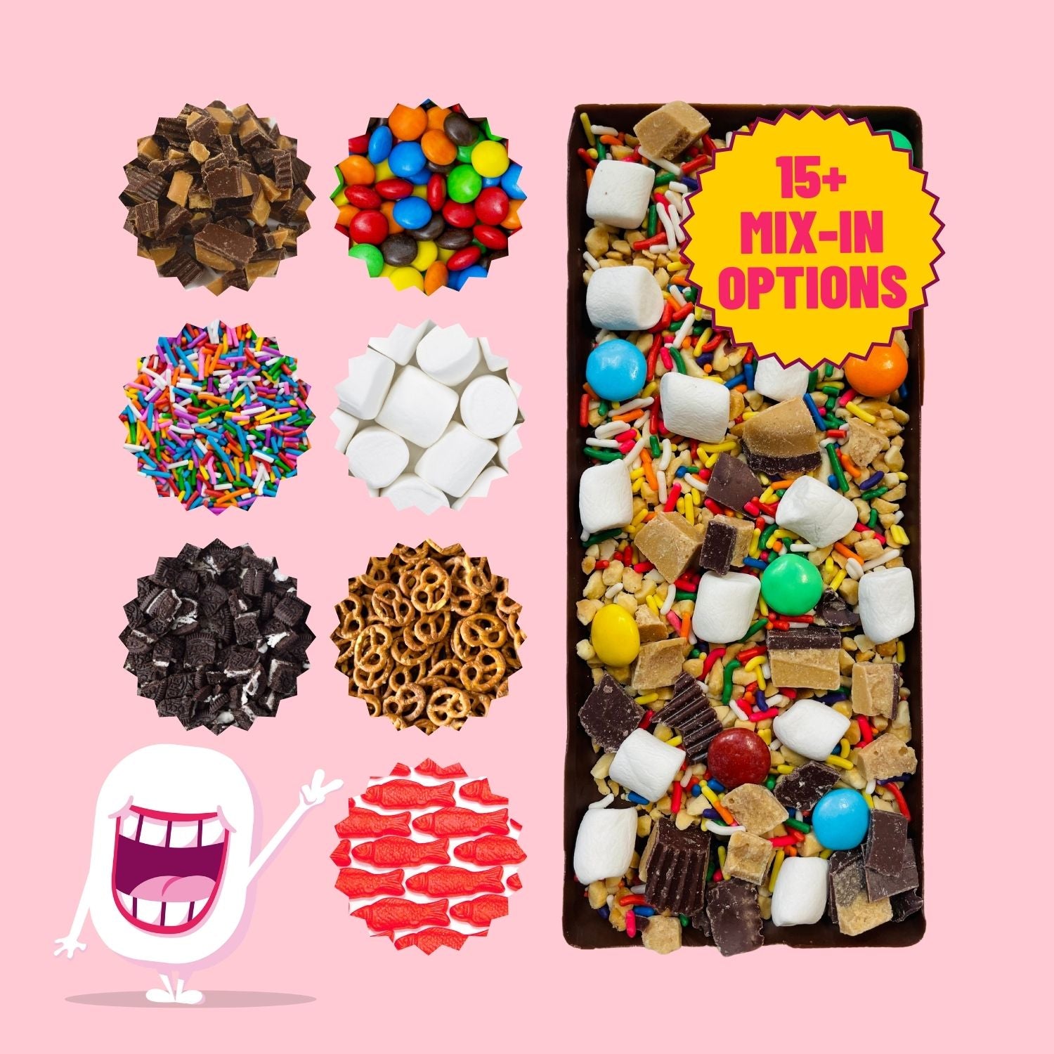 We built The Factory. You Build The Bar. You're in control, from selecting your favorite chocolate and mix-ins to naming your custom bar.