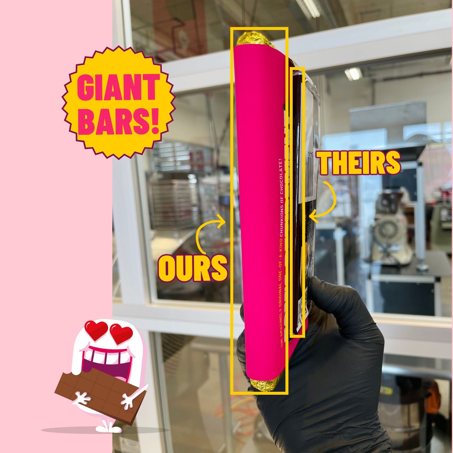 Our jumbo sized bars are over six times larger (by weight) than the leading chocolate bar. (10oz)